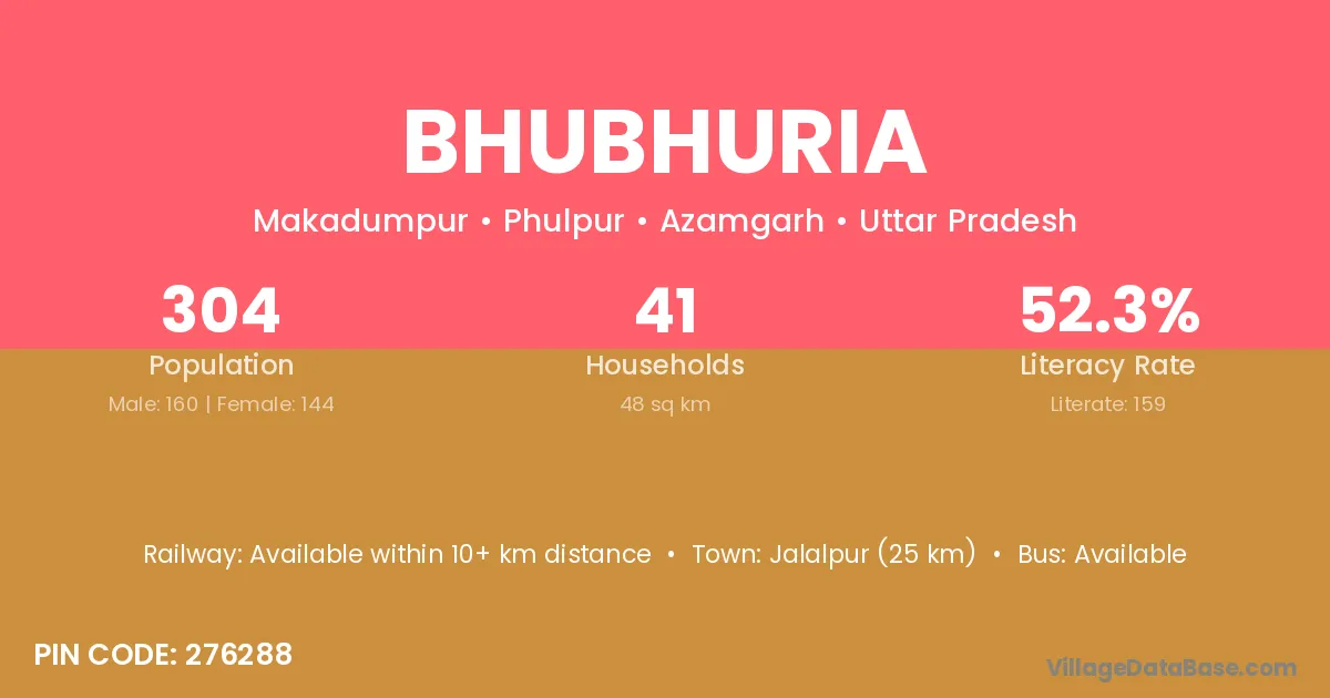 Jalalpur (25 km) is the nearest town to Bhubhuria village for major economic activities and is located approximately 25 km away.