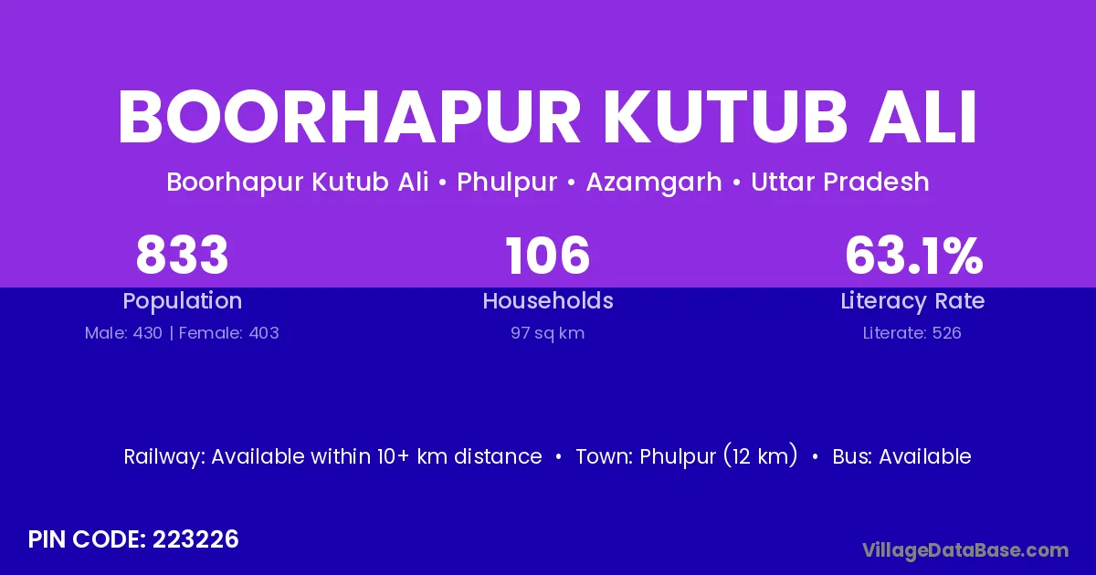 Boorhapur Kutub Ali village has a total population of 833 people, of which 430 are males and 403 are females.