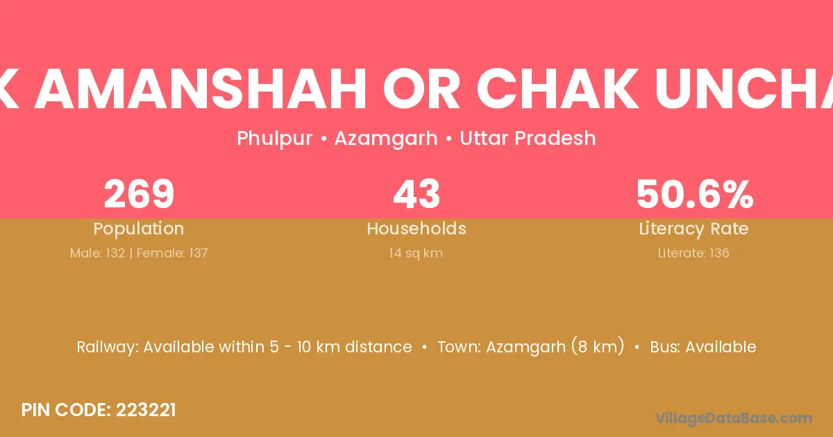 Azamgarh (8 km) is the nearest town to Chak Amanshah Or Chak Unchasha village for major economic activities and is located approximately 8 km away.