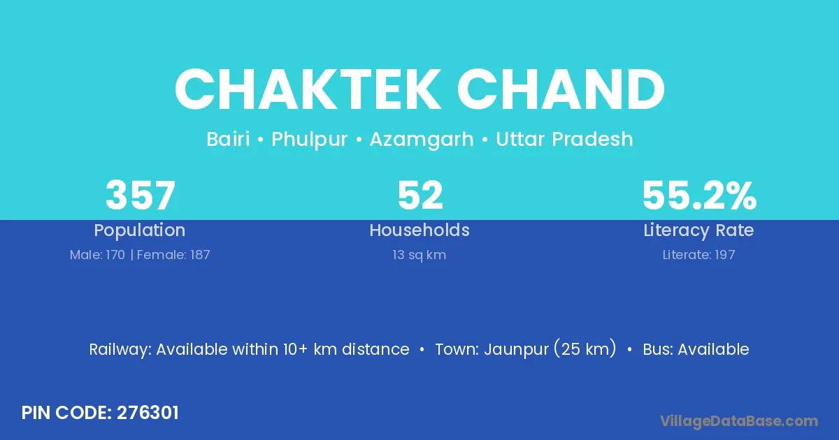 Jaunpur (25 km) is the nearest town to Chaktek Chand village for major economic activities and is located approximately 25 km away.