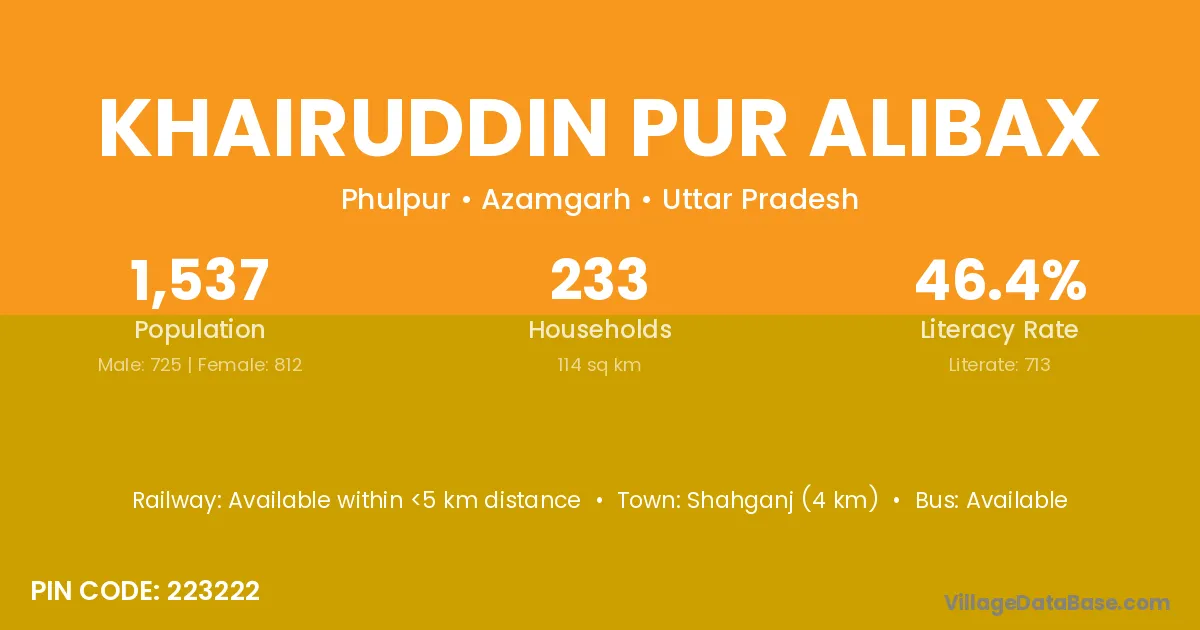 Shahganj (4 km) is the nearest town to Khairuddin Pur Alibax village for major economic activities and is located approximately 4 km away.