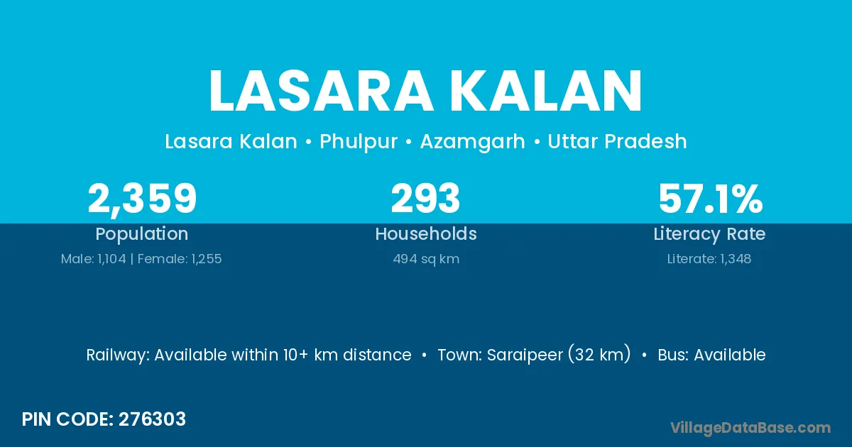 Saraipeer (32 km) is the nearest town to Lasara Kalan village for major economic activities and is located approximately 32 km away.