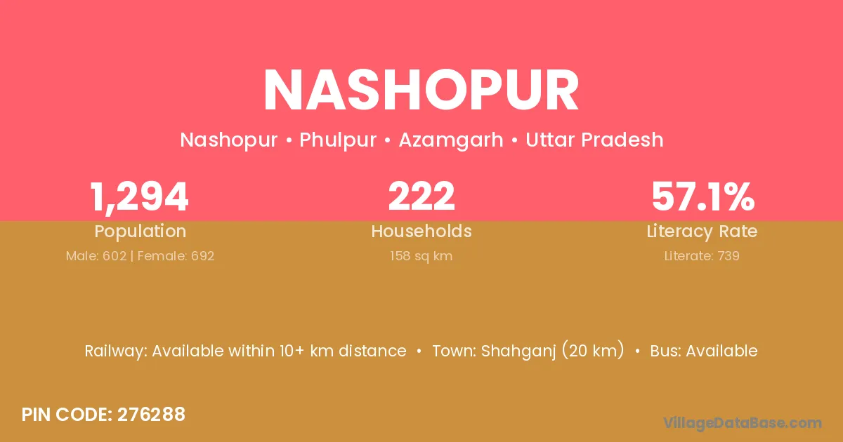 Shahganj (20 km) is the nearest town to Nashopur village for major economic activities and is located approximately 20 km away.