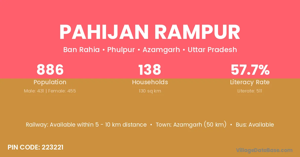 Azamgarh (50 km) is the nearest town to Pahijan Rampur village for major economic activities and is located approximately 50 km away.