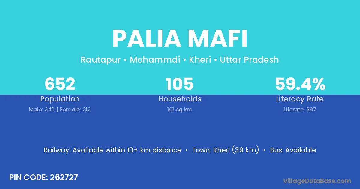 The literacy rate of Palia Mafi village is 63.63%. Male literacy stands at 73.32% and female literacy at 54.56%.