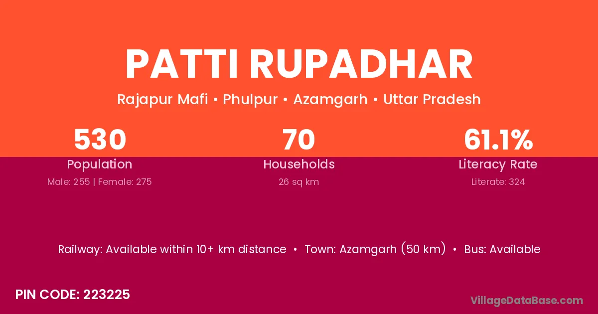 Azamgarh (50 km) is the nearest town to Patti Rupadhar village for major economic activities and is located approximately 50 km away.