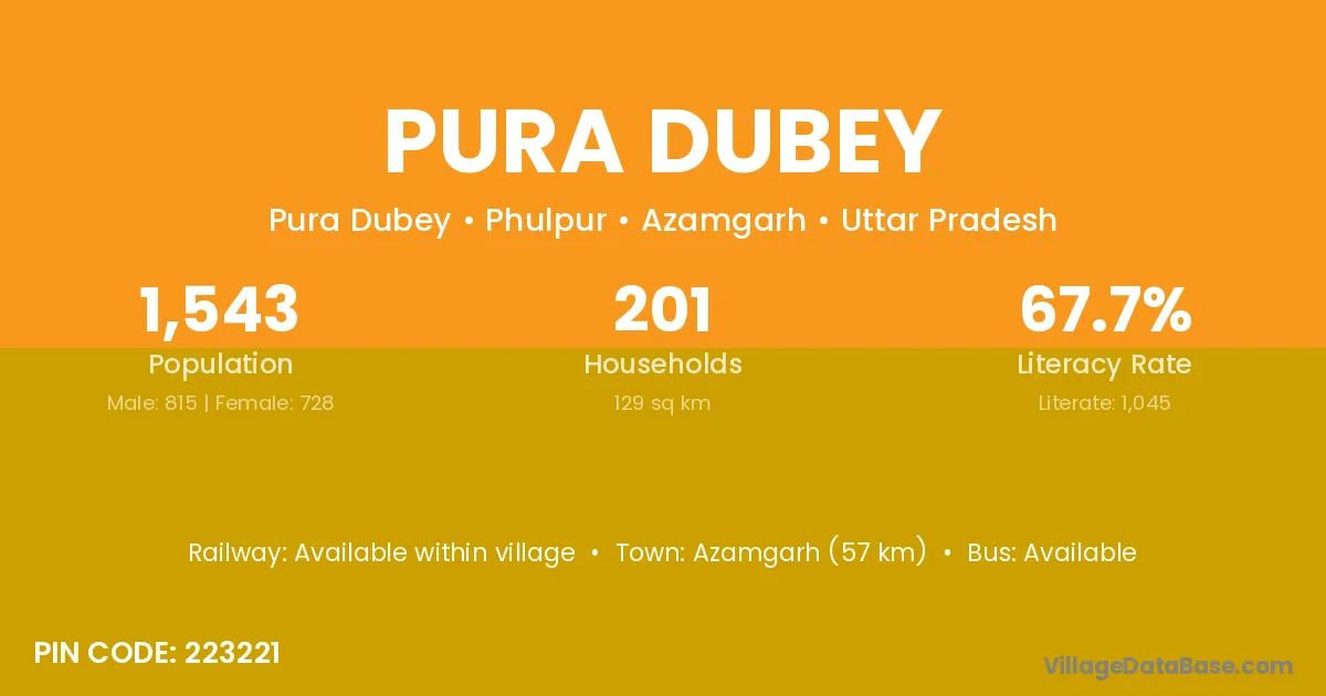 Azamgarh (57 km) is the nearest town to Pura Dubey village for major economic activities and is located approximately 57 km away.