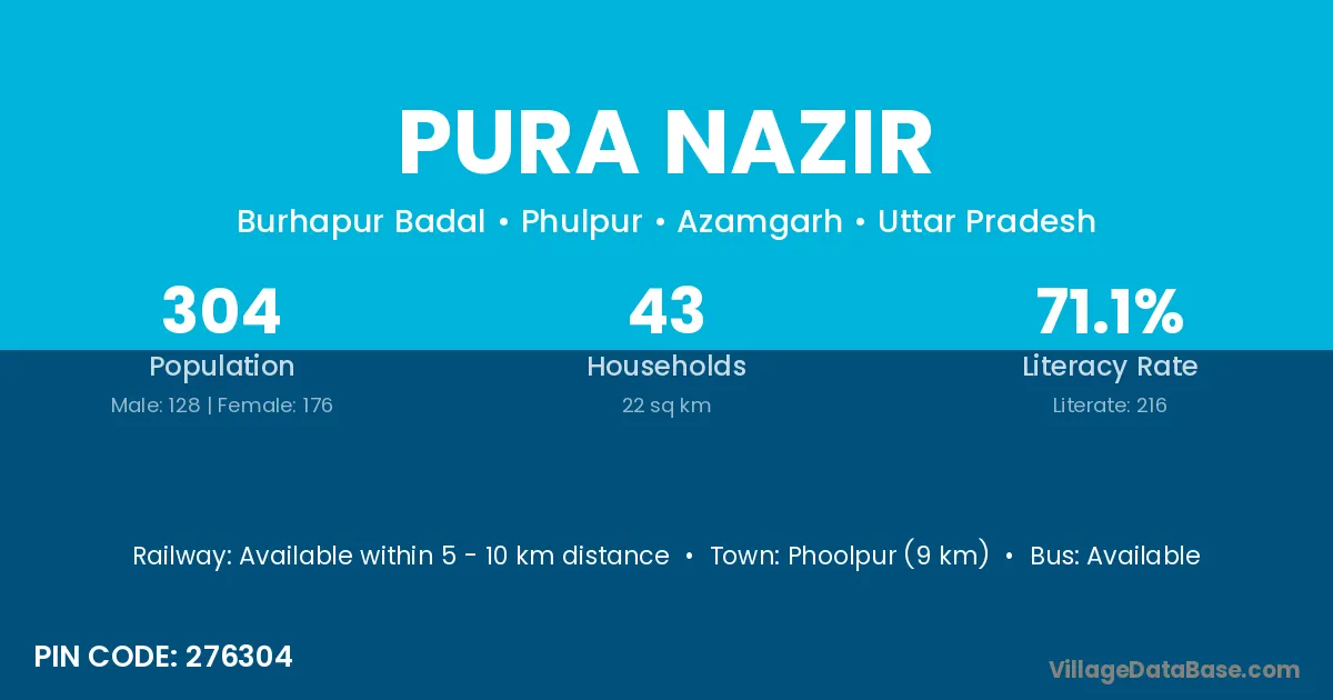 Phoolpur (9 km) is the nearest town to Pura Nazir village for major economic activities and is located approximately 9 km away.