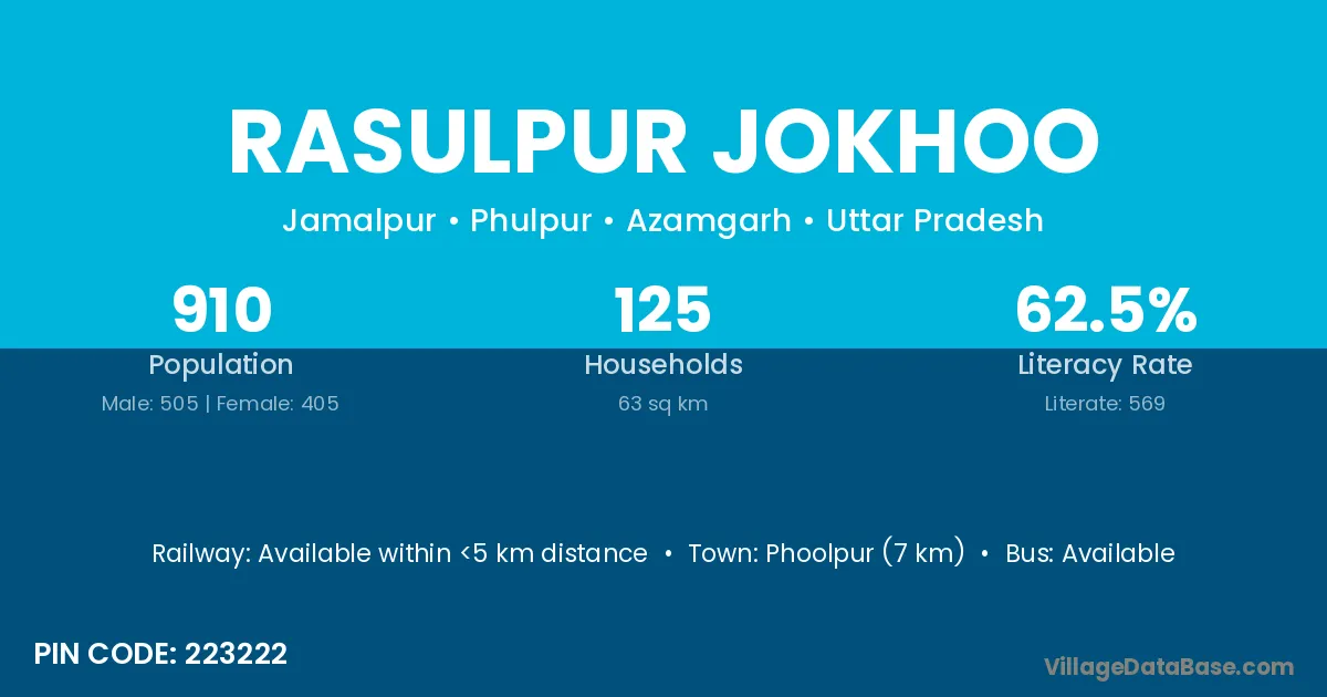 Phoolpur (7 km) is the nearest town to Rasulpur Jokhoo village for major economic activities and is located approximately 7 km away.