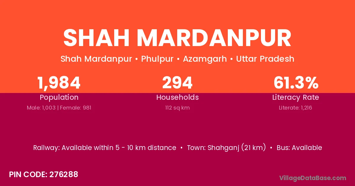 Shahganj (21 km) is the nearest town to Shah Mardanpur village for major economic activities and is located approximately 21 km away.