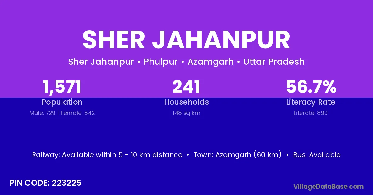 Azamgarh (60 km) is the nearest town to Sher Jahanpur village for major economic activities and is located approximately 60 km away.