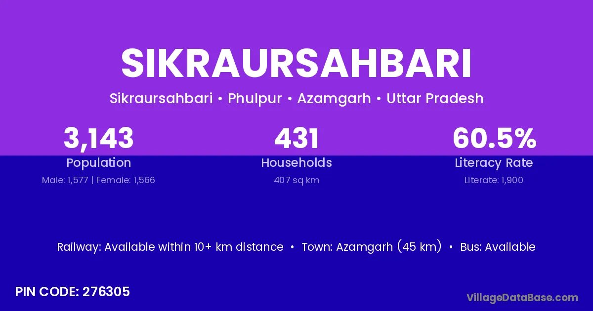 Azamgarh (45 km) is the nearest town to Sikraursahbari village for major economic activities and is located approximately 45 km away.