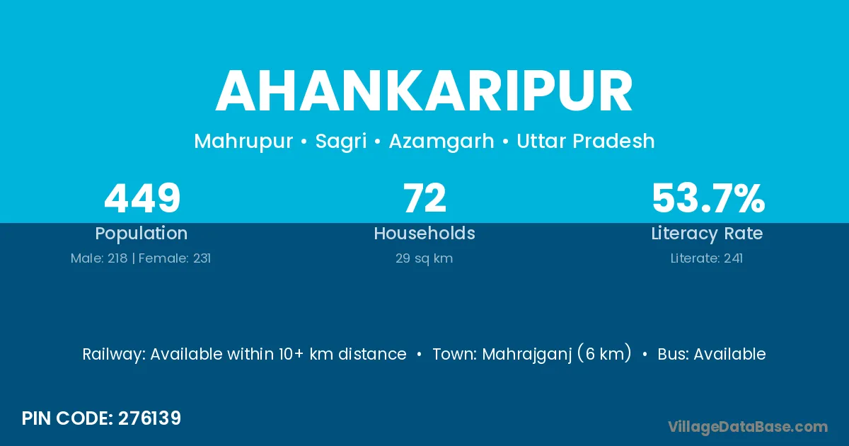 Mahrajganj (6 km) is the nearest town to Ahankaripur village for major economic activities and is located approximately 6 km away.