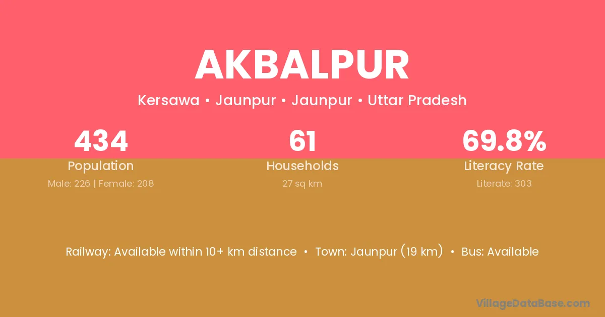 The literacy rate of Akbalpur village is 87.90%. Male literacy stands at 98.46% and female literacy at 76.27%.