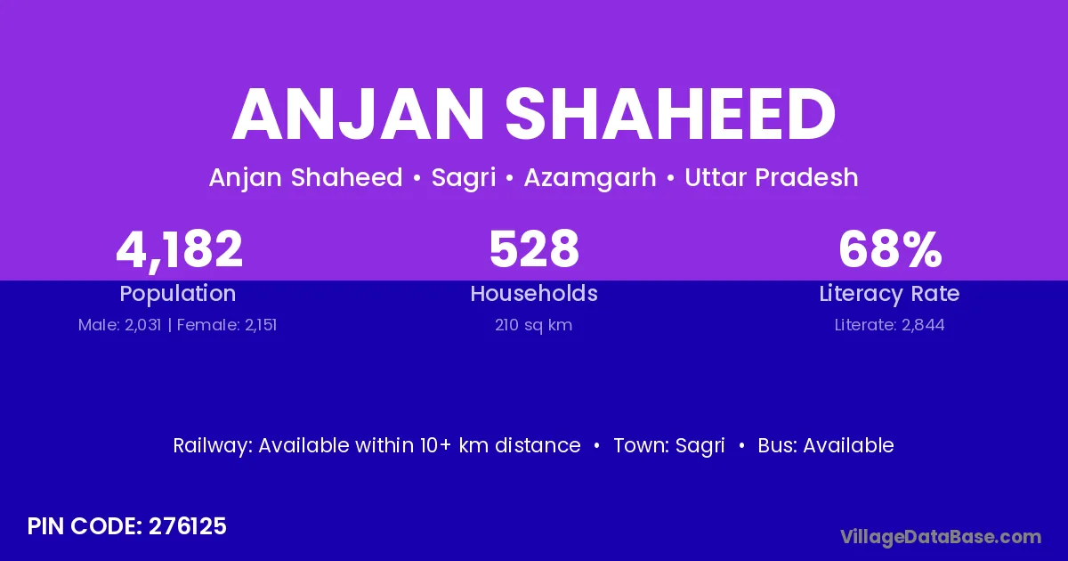 Anjan Shaheed village has a total population of 4,182 people, of which 2,031 are males and 2,151 are females.