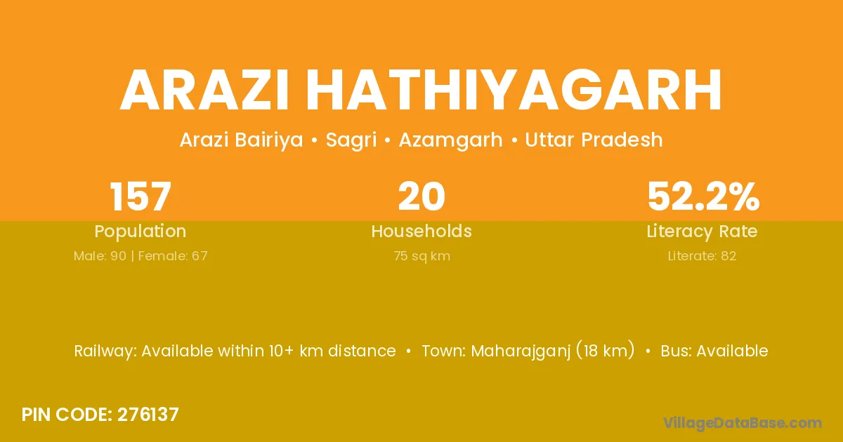 Arazi Hathiyagarh village has a total population of 157 people, of which 90 are males and 67 are females.