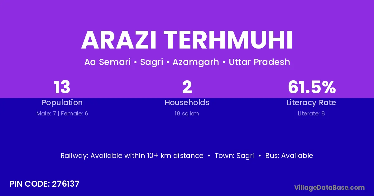 Arazi Terhmuhi village has a total population of 13 people, of which 7 are males and 6 are females.
