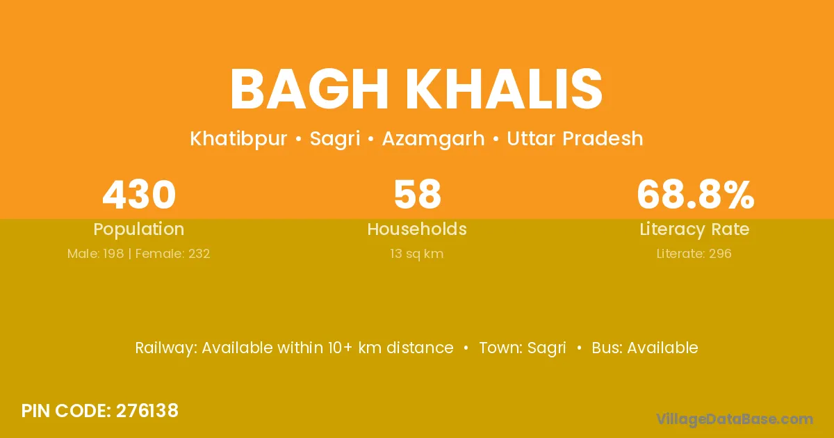 Bagh Khalis village has a total population of 430 people, of which 198 are males and 232 are females.