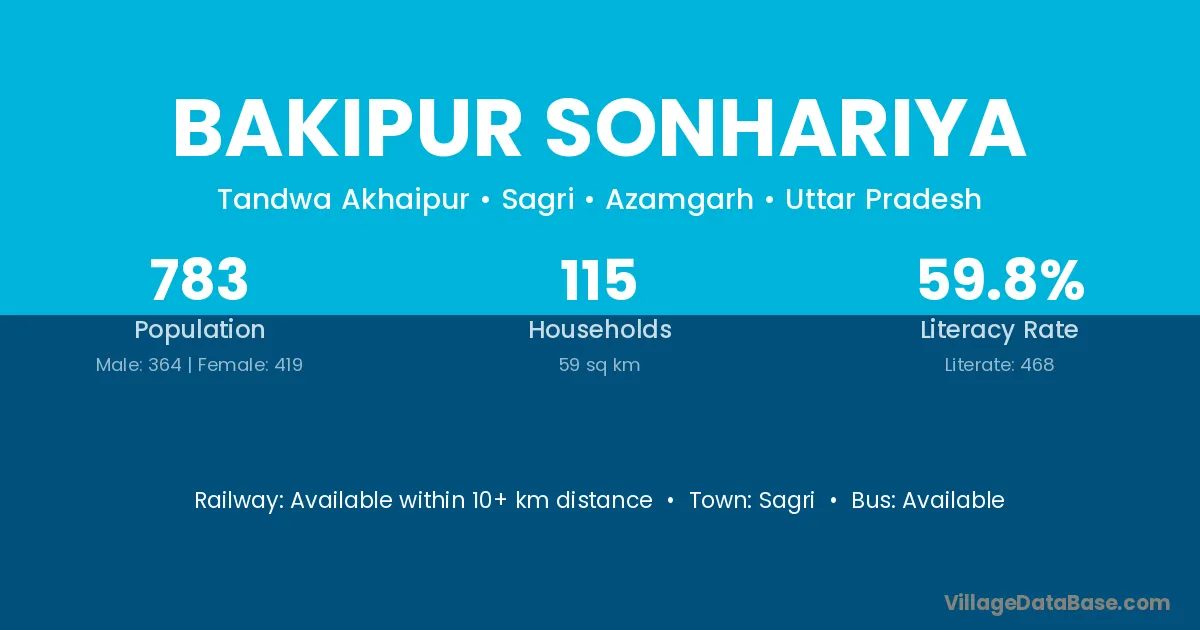 Bakipur Sonhariya village has a total population of 783 people, of which 364 are males and 419 are females.