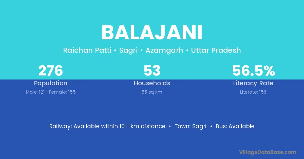 Balajani village has a total population of 276 people, of which 121 are males and 155 are females.
