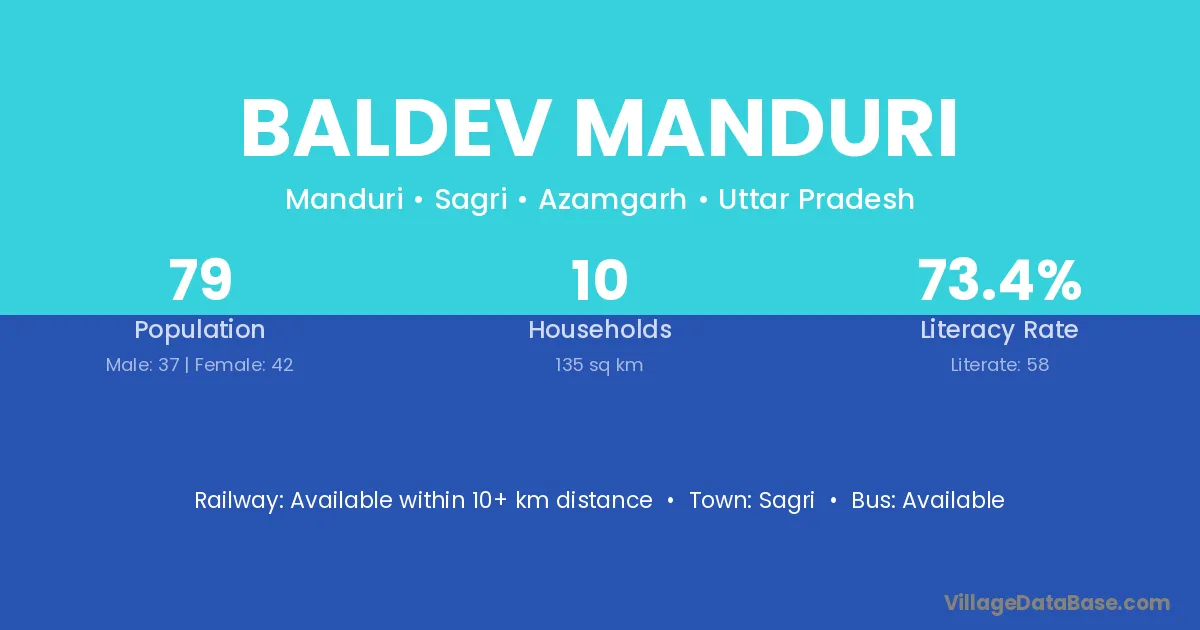 Baldev Manduri village has a total population of 79 people, of which 37 are males and 42 are females.