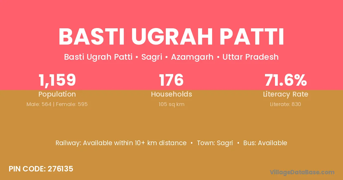 Basti Ugrah Patti village has a total population of 1,159 people, of which 564 are males and 595 are females.