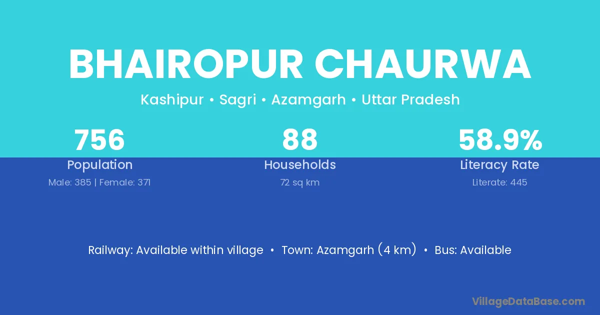 Azamgarh (4 km) is the nearest town to Bhairopur Chaurwa village for major economic activities and is located approximately 4 km away.