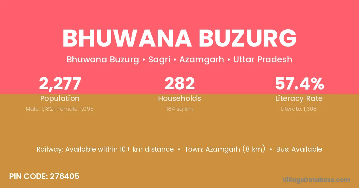 Azamgarh (8 km) is the nearest town to Bhuwana Buzurg village for major economic activities and is located approximately 8 km away.