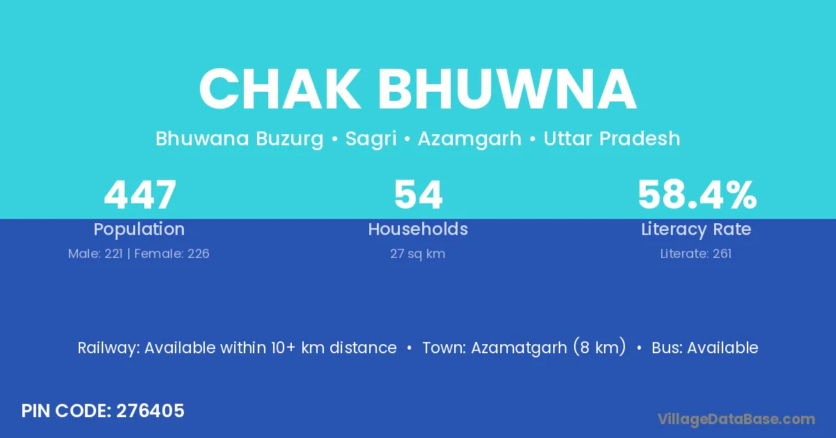 Azamatgarh (8 km) is the nearest town to Chak Bhuwna village for major economic activities and is located approximately 8 km away.