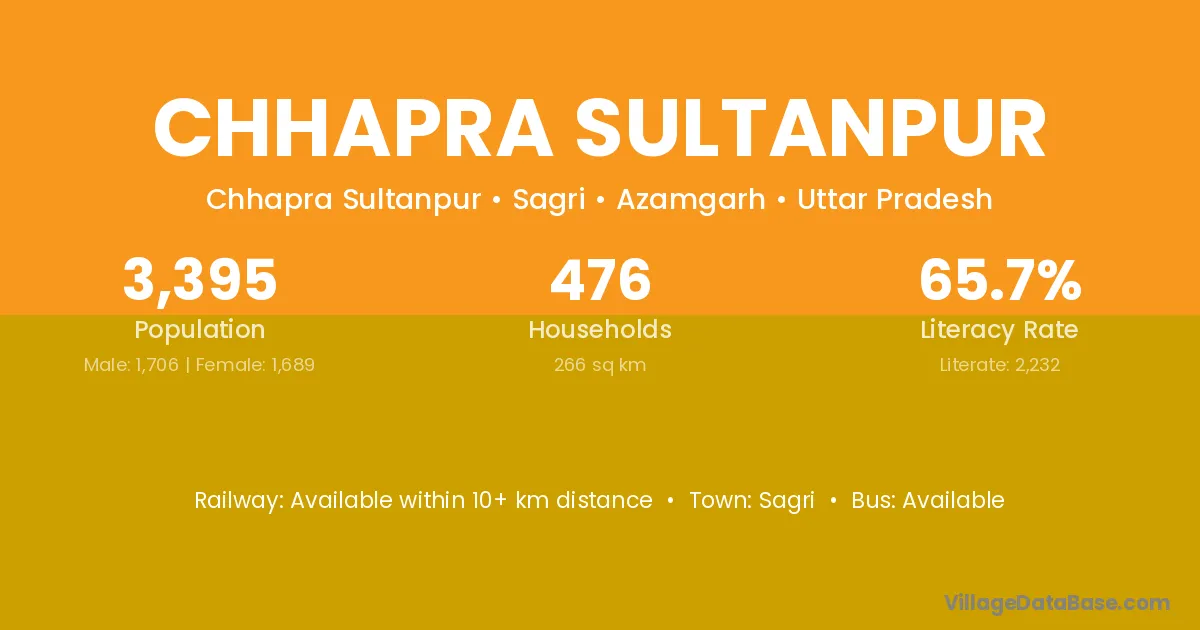 Chhapra Sultanpur village has a total population of 3,395 people, of which 1,706 are males and 1,689 are females.