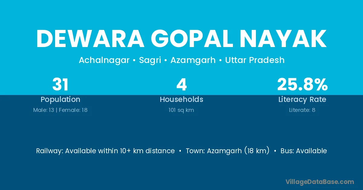 Azamgarh (18 km) is the nearest town to Dewara Gopal Nayak village for major economic activities and is located approximately 18 km away.