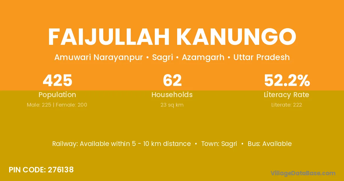 Faijullah Kanungo village has a total population of 425 people, of which 225 are males and 200 are females.