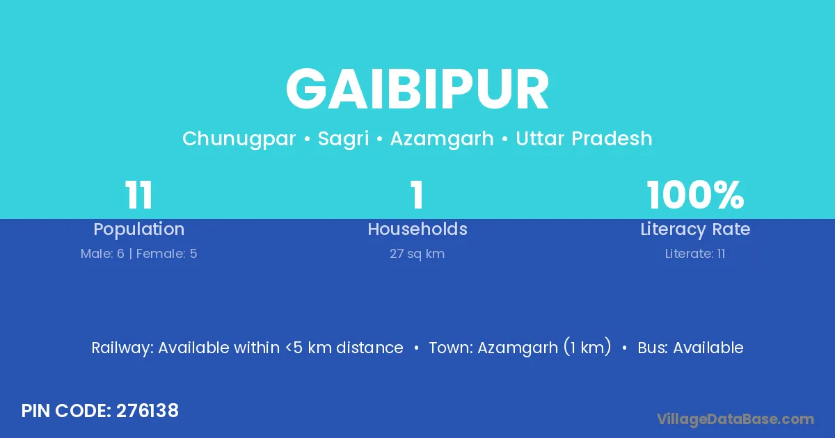 Azamgarh (1 km) is the nearest town to Gaibipur village for major economic activities and is located approximately 1 km away.