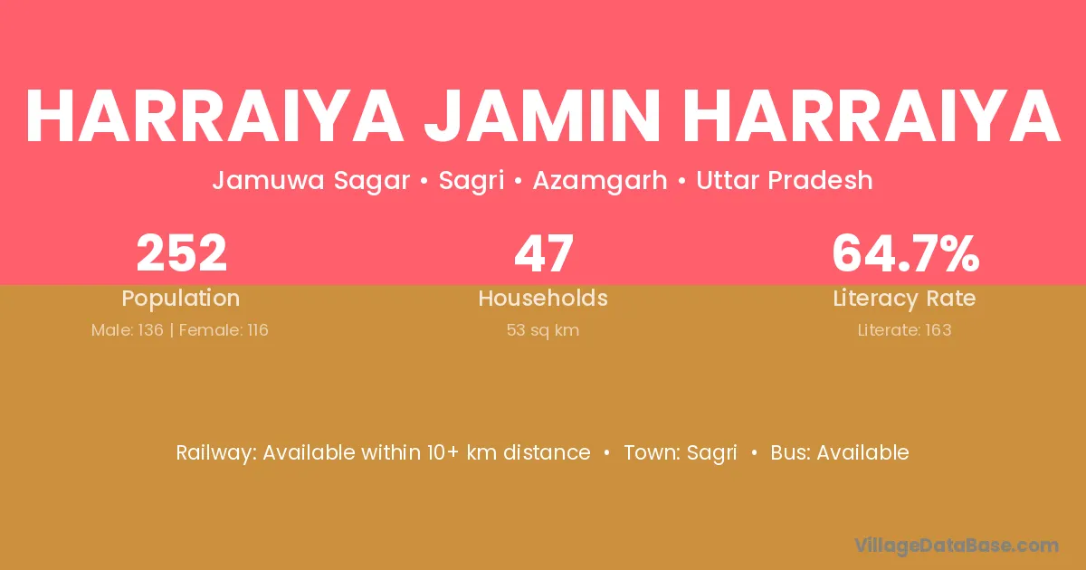 Harraiya Jamin Harraiya village has a total population of 252 people, of which 136 are males and 116 are females.
