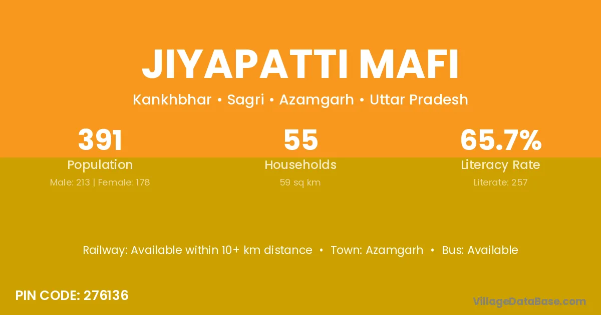 Azamgarh is the nearest town to Jiyapatti Mafi village for major economic activities