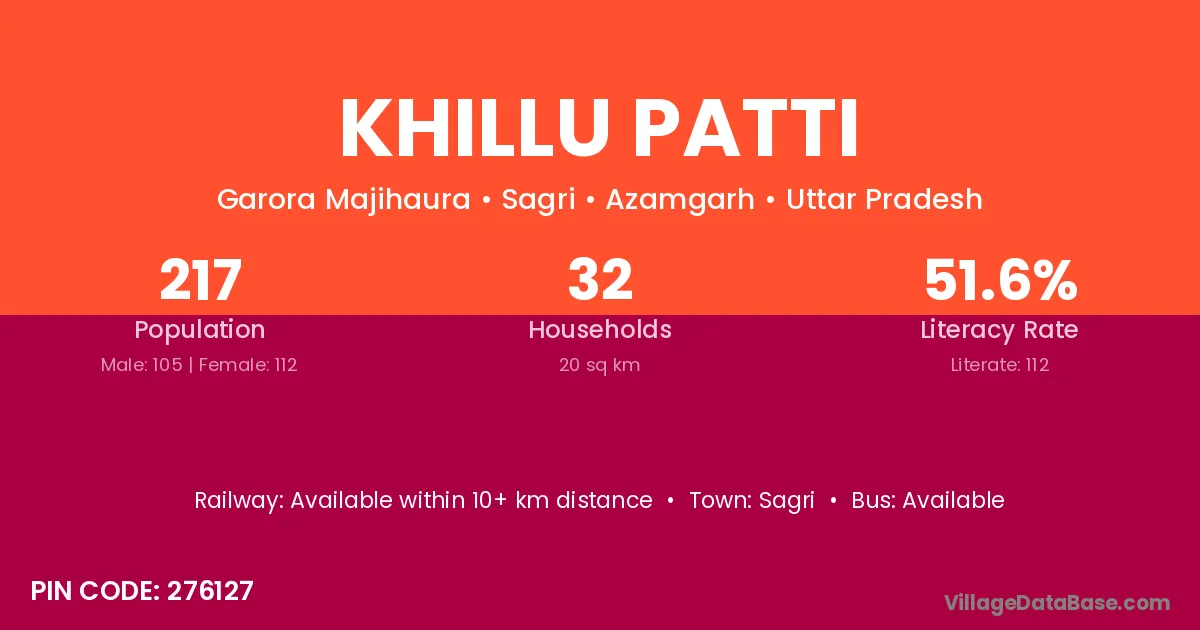 Khillu Patti village has a total population of 217 people, of which 105 are males and 112 are females.