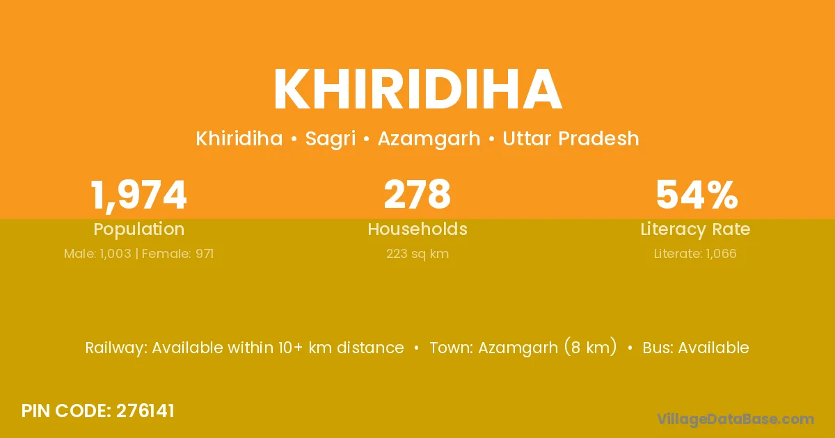 Azamgarh (8 km) is the nearest town to Khiridiha village for major economic activities and is located approximately 8 km away.
