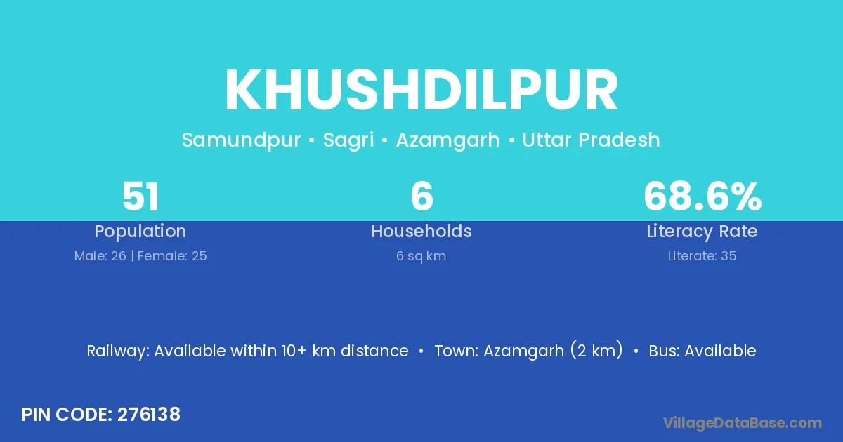 Azamgarh (2 km) is the nearest town to Khushdilpur village for major economic activities and is located approximately 2 km away.