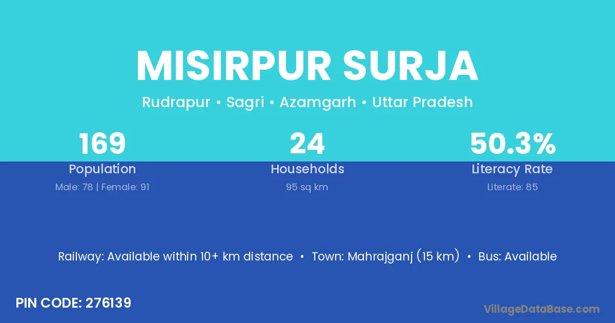 Misirpur Surja village has a total population of 169 people, of which 78 are males and 91 are females.