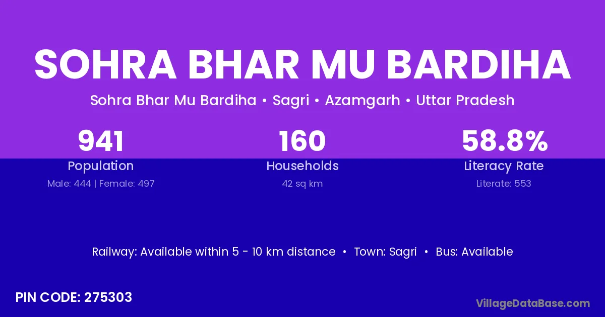 Sohra Bhar Mu Bardiha village has a total population of 941 people, of which 444 are males and 497 are females.