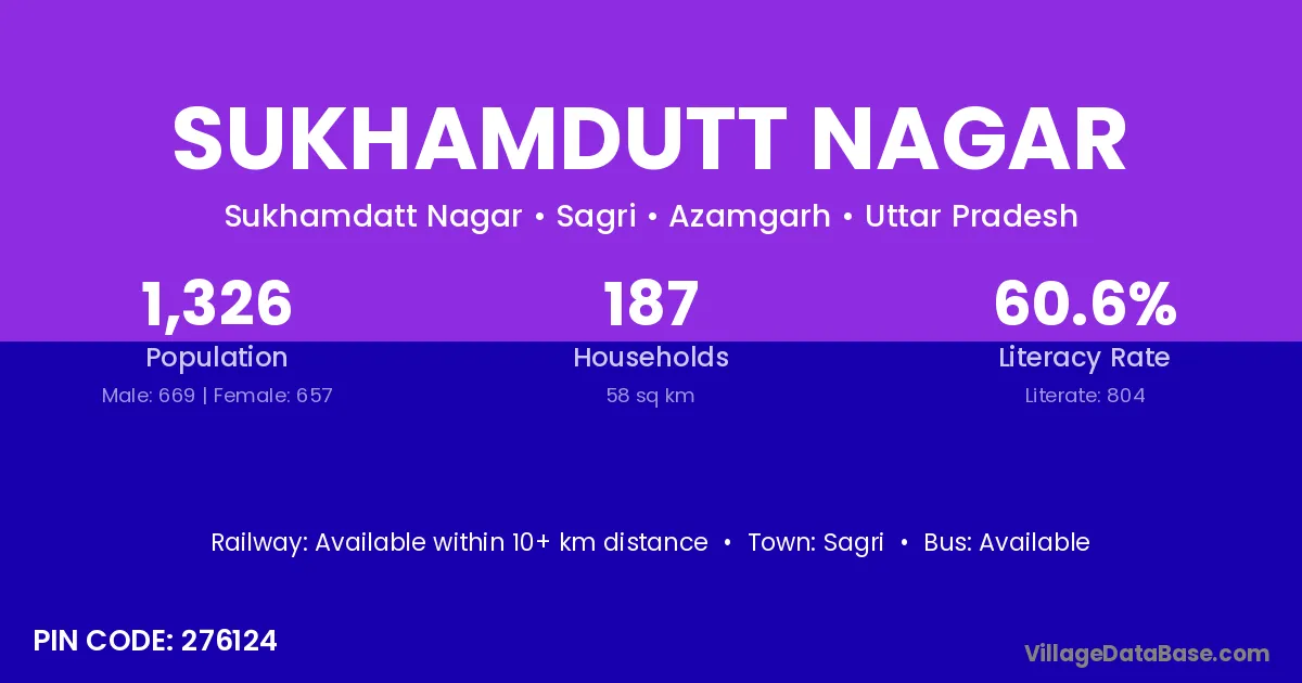 Sukhamdutt Nagar village has a total population of 1,326 people, of which 669 are males and 657 are females.