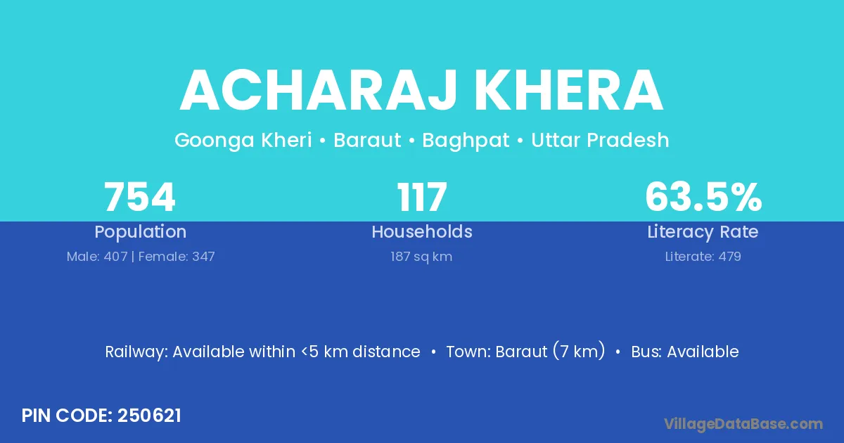 Baraut (7 km) is the nearest town to Acharaj Khera village for major economic activities and is located approximately 7 km away.