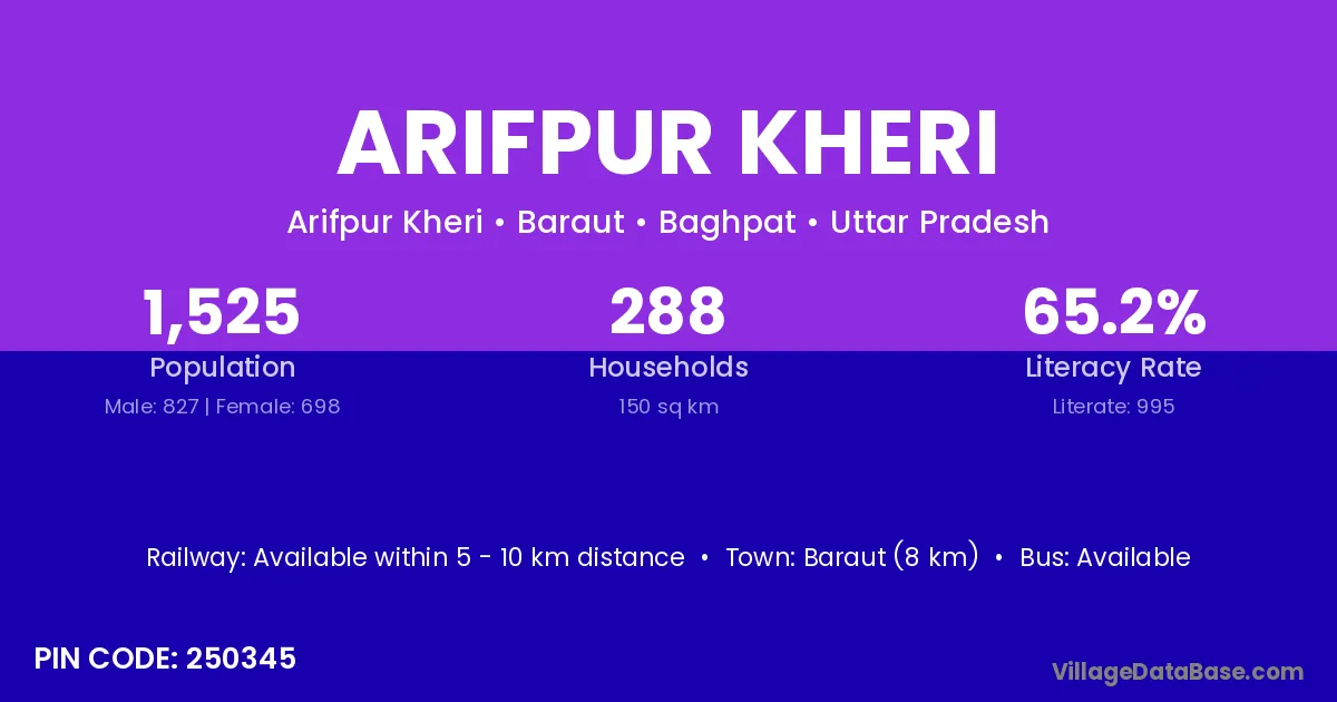 Baraut (8 km) is the nearest town to Arifpur Kheri village for major economic activities and is located approximately 8 km away.