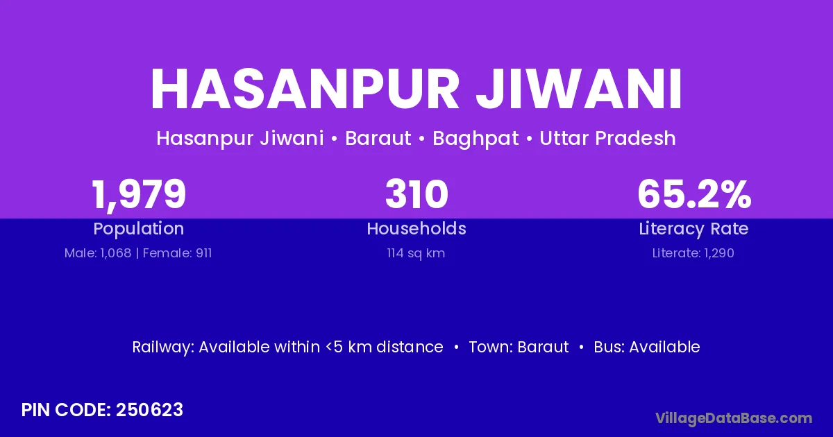Hasanpur Jiwani village has a total population of 1,979 people, of which 1,068 are males and 911 are females.