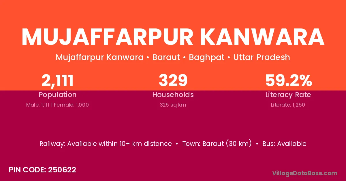 Mujaffarpur Kanwara village has a total population of 2,111 people, of which 1,111 are males and 1,000 are females.