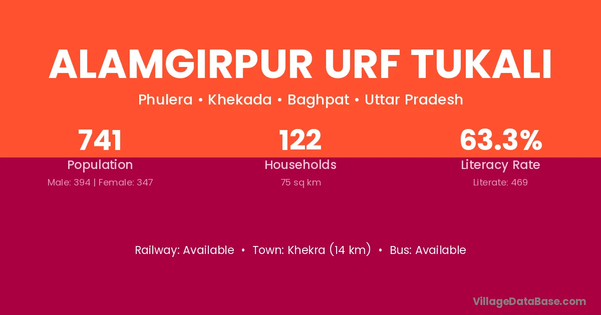 Alamgirpur Urf Tukali village has a total population of 741 people, of which 394 are males and 347 are females.
