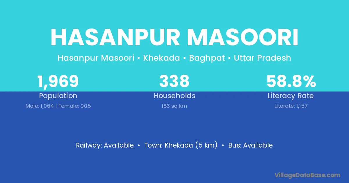 Khekada (5 km) is the nearest town to Hasanpur Masoori village for major economic activities and is located approximately 5 km away.