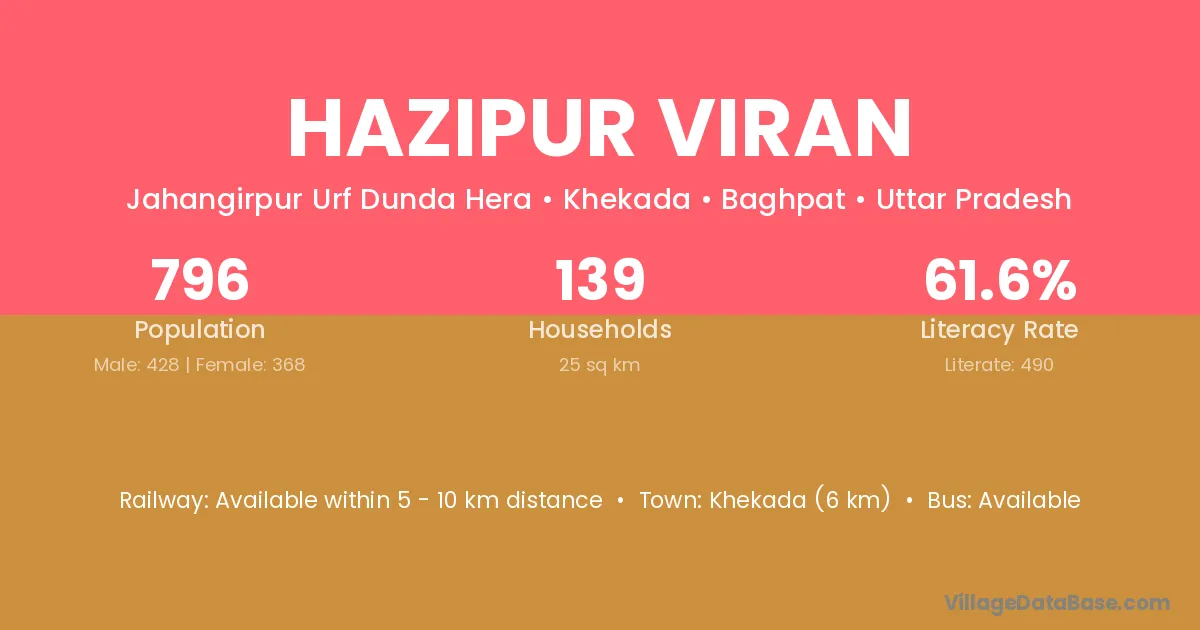 Khekada (6 km) is the nearest town to Hazipur Viran village for major economic activities and is located approximately 6 km away.