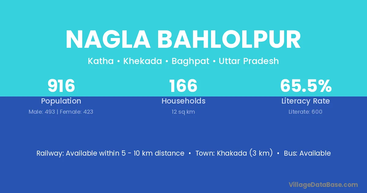 Nagla Bahlolpur village has a total population of 916 people, of which 493 are males and 423 are females.