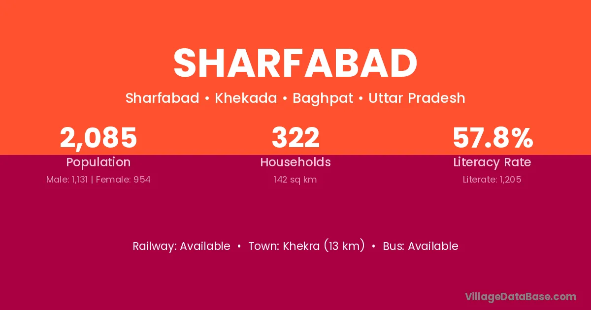 Khekra (13 km) is the nearest town to Sharfabad village for major economic activities and is located approximately 13 km away.